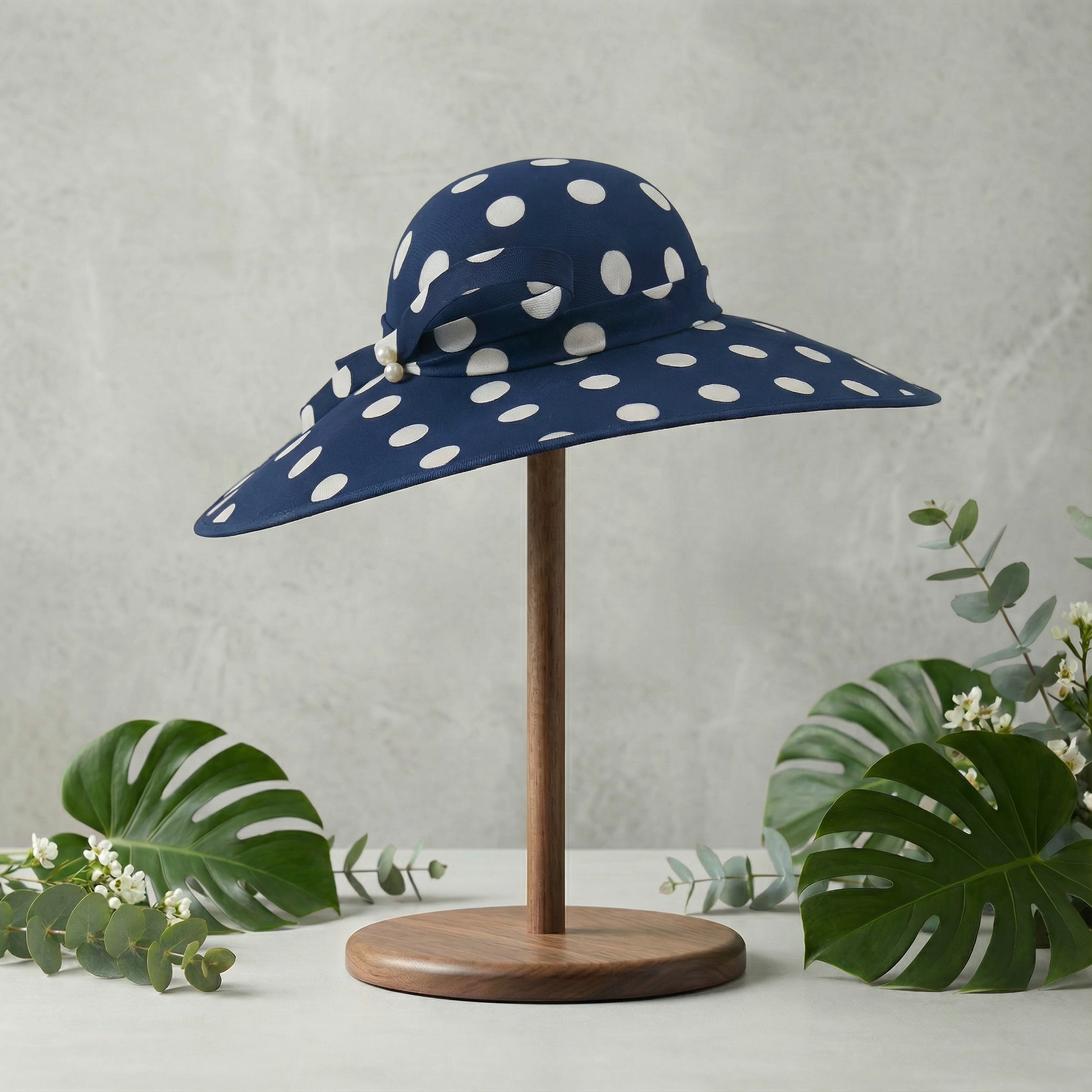 Ideal for women searching for a navy polka dot hat, wide-brim race-day hat, or navy spot fascinator alternative, this design blends charm and dramatic elegance.